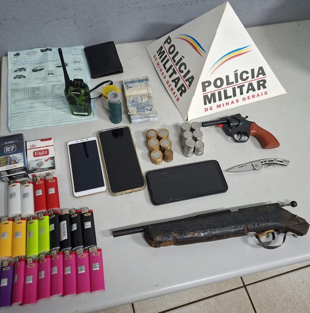 Ação rápida das equipes resultou na captura de dois homens, dois menores e na apreensão de armas e produtos roubados.Na noite de quarta-feira (13), a Polícia Militar prendeu dois homens, de 25 e 20 anos, e apreendeu dois menores, de 15 e 17 anos, envolvidos em um roubo a um estabelecimento comercial no bairro Bela Vista, em Lagoa Formosa. Por volta das 21h59, a PM foi acionada para atender à ocorrência. Segundo informações, dois indivíduos encapuzados, usando blusas com capuz, um armado com arma de fogo e outro simulando estar armado, entraram no comércio e anunciaram o assalto. Durante a ação, subtraíram dinheiro, cigarros e isqueiros. Em seguida, fugiram em um veículo Gol prata, onde outros dois comparsas aguardavam para a fuga. As características dos suspeitos e do veículo foram repassadas imediatamente via rede de rádio para todas as equipes da Polícia Militar da região. As guarnições iniciaram diligências e, já em Patos de Minas, localizaram o carro suspeito transitando pela Avenida JK. Ao perceberem a aproximação das viaturas, os ocupantes tentaram fugir, mas foram interceptados e abordados. Dentro do veículo, os militares encontraram o material roubado — dinheiro, cigarros e isqueiros — além de uma arma artesanal tipo cartucheira, um simulacro de revólver, munições, um rádio comunicador e outros objetos possivelmente utilizados no crime. Diante dos fatos, os autores foram conduzidos à Delegacia de Polícia Civil de Patos de Minas, juntamente com o material apreendido e o veículo utilizado na ação criminosa.