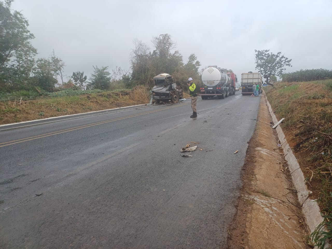 Na manhã desta terça-feira (24), a Polícia Militar Rodoviária foi acionada para atender a um grave acidente de trânsito no km 221 da BR-352, no município de Carmo do Paranaíba. O sinistro envolveu um caminhão M. Benz/Atron, conduzido por um homem de 42 anos, que transportava um passageiro de 27 anos — ambos naturais de Carmo do Paranaíba — e uma combinação veicular composta por um cavalo trator M. Benz Axor tracionando dois semirreboques, conduzido por um motorista de 40 anos, de Lagoa Formosa.