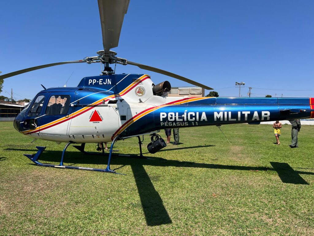 Aeronave da PMMG realiza sobrevoo e pouso estratégico na Arena Boca Júnior, reforçando a segurança em Carmo do Paranaíba.