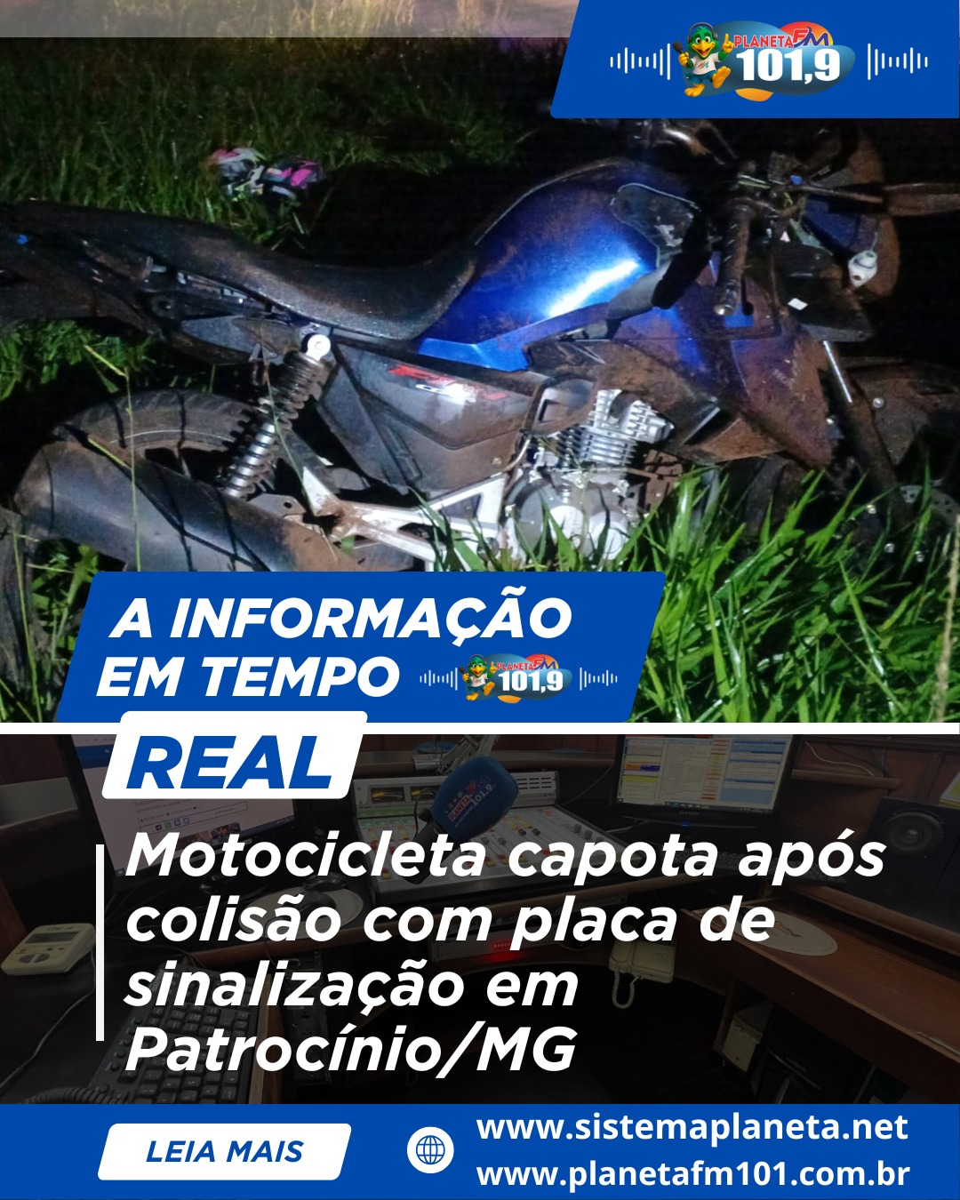 Conforme apurado, a motocicleta trafegava no sentido Araxá–Patrocínio, quando, no km 87 da MG-230, no trevo de acesso à mineradora Mosaic, o condutor — que não possui CNH — colidiu com uma placa de sinalização, perdeu o controle direcional do veículo e capotou sobre o canteiro central.