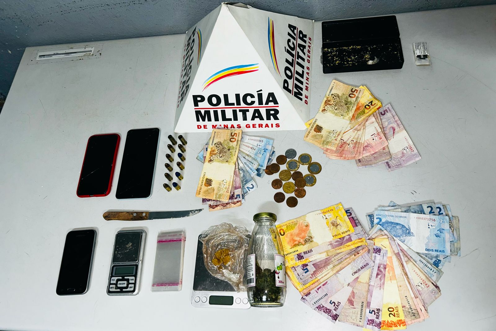 Durante as buscas na residência, a equipe localizou, no parapeito da janela da sala, resquícios de crack, lâminas utilizadas para fracionamento de drogas, uma faca com vestígios de entorpecentes e um pote com porção de maconha conhecida como Colombia Gold. Também foram encontrados uma caixinha com resquícios de crack, uma balança de precisão sob o sofá com vestígios da mesma substância, um pote com cocaína, uma bucha de maconha e R$140,45 em dinheiro. Dois celulares — um iPhone branco e um Samsung preto — também foram apreendidos.