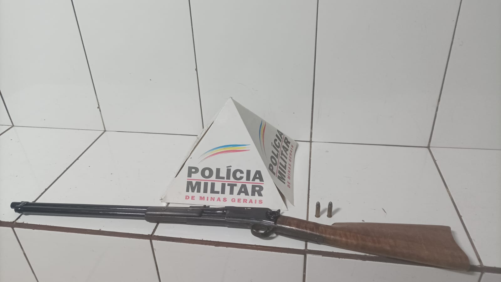 Com base nas informações recebidas, as equipes da PM realizaram diligências na localidade e, após intensas buscas, localizaram uma espingarda calibre .38, além de duas munições. O armamento estava escondido dentro de uma bolsa preta, camuflada entre a vegetação.