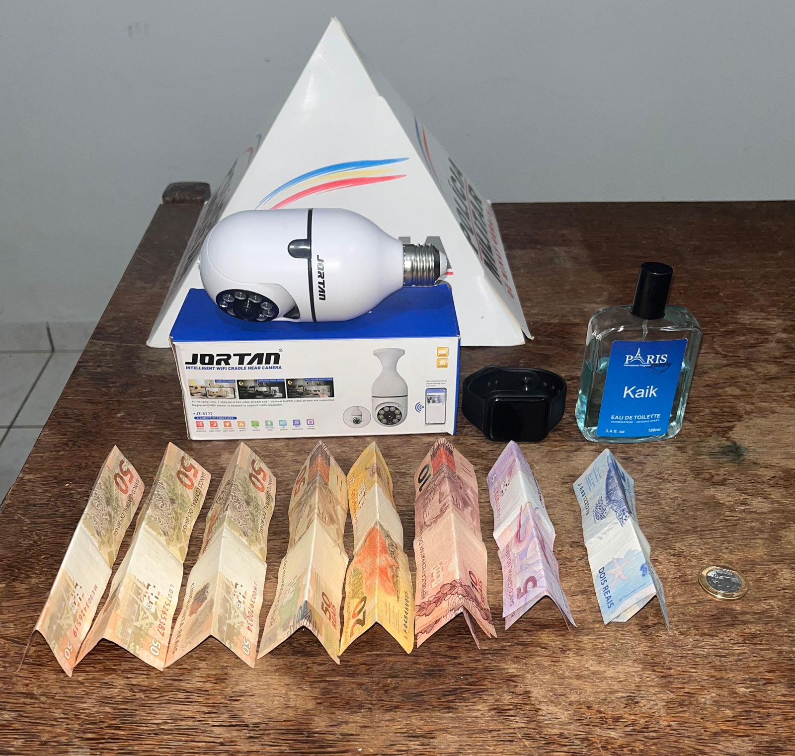 Durante a verificação, descobriu-se que o suspeito estava hospedado em um hotel da cidade desde o dia 16/07. No quarto, os policiais encontraram diversos objetos sem comprovação de origem, entre eles uma câmera de videomonitoramento, um relógio e um perfume. Questionado, o homem acabou confessando que havia furtado os itens de uma residência e indicou o local do crime.