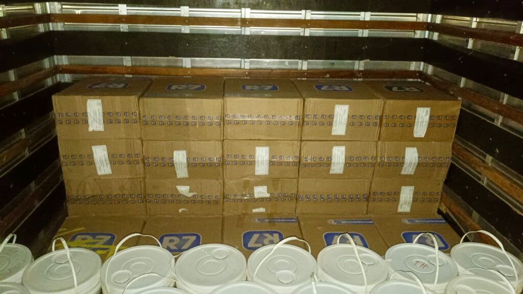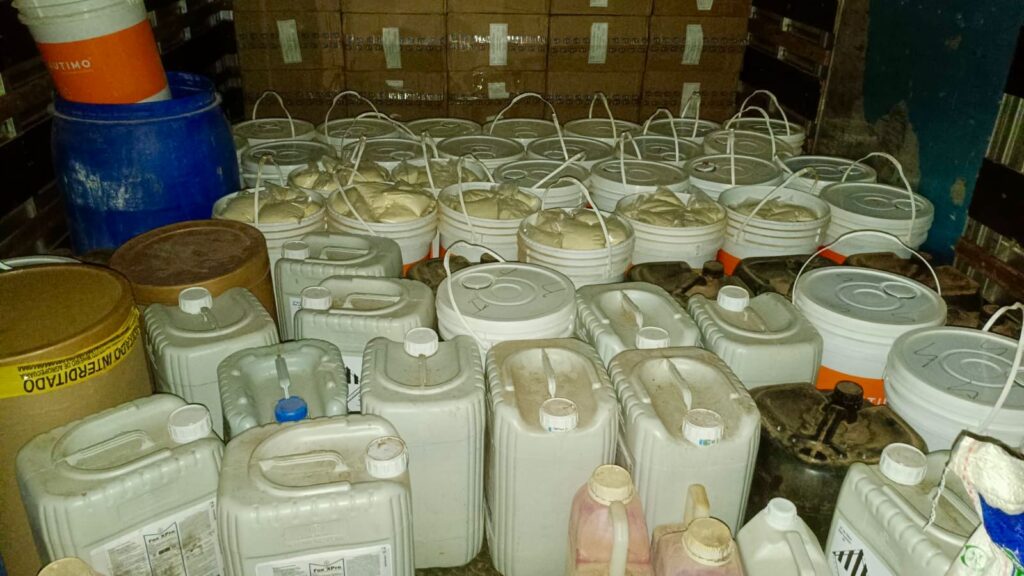 De posse das informações, equipes policiais se deslocaram até o endereço indicado e constataram que o portão de uma residência ainda em construção encontrava-se aberto. No interior do imóvel, os militares flagraram dois indivíduos, de 16 e 43 anos, utilizando equipamentos de proteção individual enquanto manipulavam, pesavam e selavam produtos agropecuários em uma estrutura improvisada semelhante a um laboratório. No local, havia diversas embalagens espalhadas e maquinário utilizado para o fracionamento e acondicionamento do material.