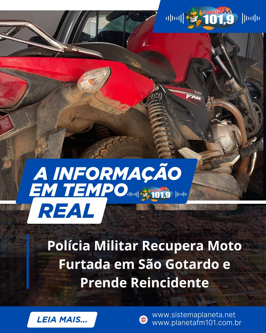 A Polícia Militar recuperou, na noite desta quinta-feira (04/12/2025), uma motocicleta furtada horas antes na área central de São Gotardo. A vítima havia estacionado o veículo em frente à residência de um familiar e, ao retornar, percebeu que a moto havia sido levada.