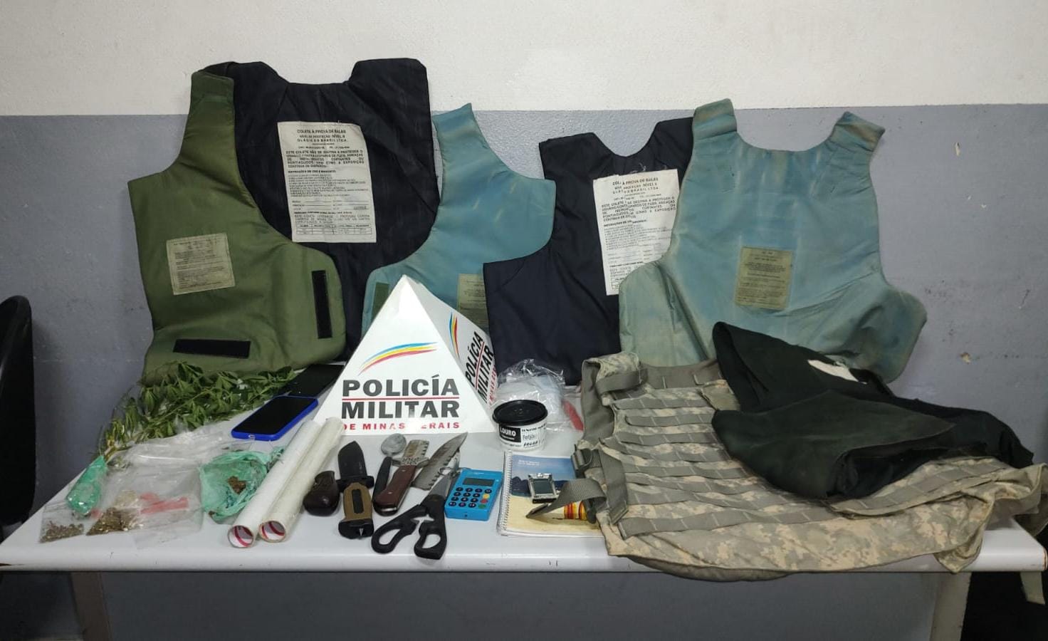Além disso, foram encontrados dois coletes balísticos: um com capa camuflada, semelhante ao da Polícia Penal, e outro de cor preta. O autor não quis informar a origem dos materiais. O GPCães foi acionado, mas nenhuma nova substância ilícita foi localizada. Os celulares dos autores foram apreendidos por conterem possíveis provas.