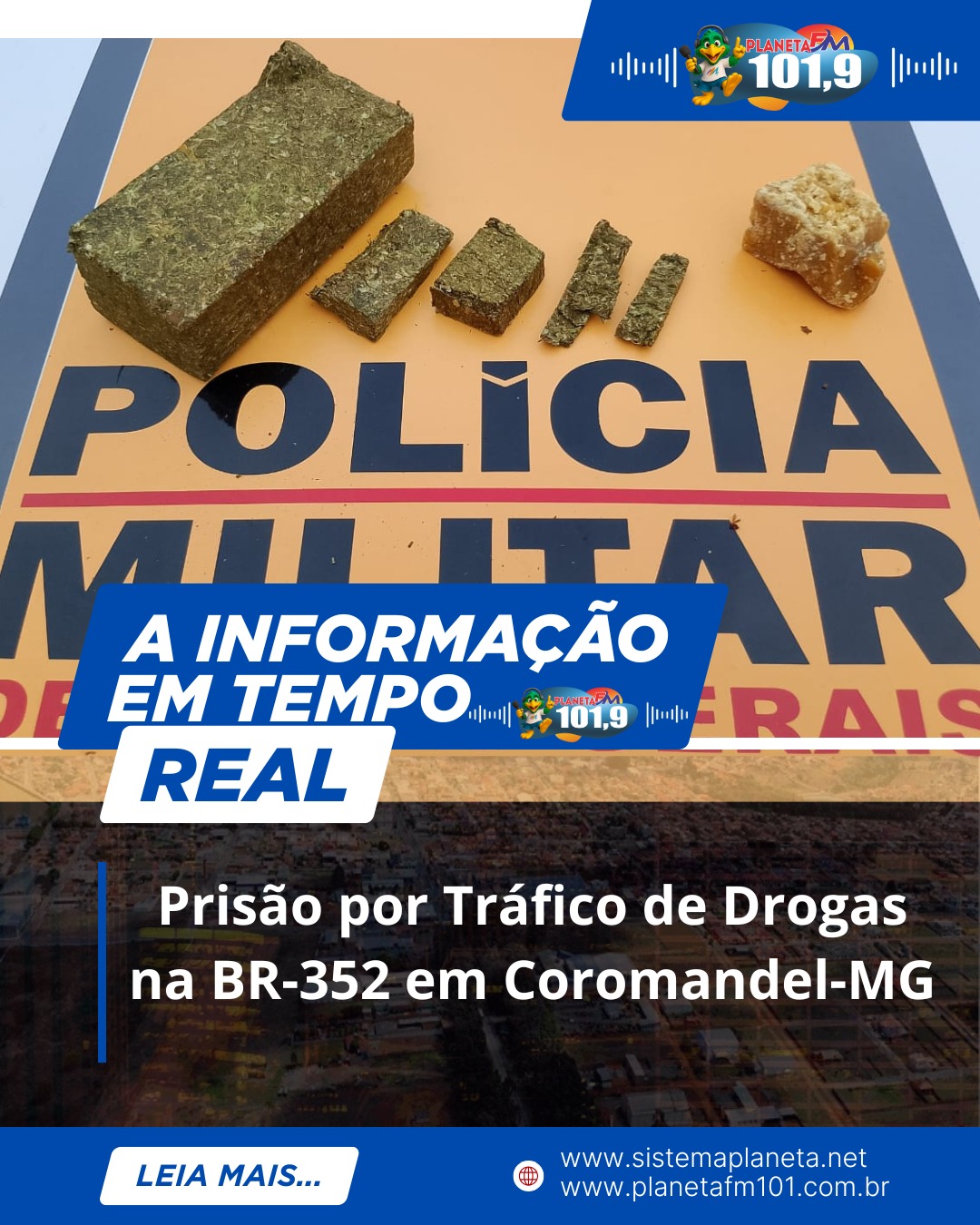 Durante o patrulhamento, uma equipe do Grupamento Rodoviário abordou uma motocicleta ocupada por dois indivíduos. Durante a averiguação, foi encontrado com o passageiro, um homem de 41 anos, 01 barra de substância análoga à maconha, 04 tabletes também de maconha e 01 pedra grande de crack.